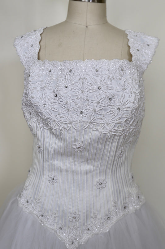 1990's Basque Waist Embroidered Corset Tulle Gown