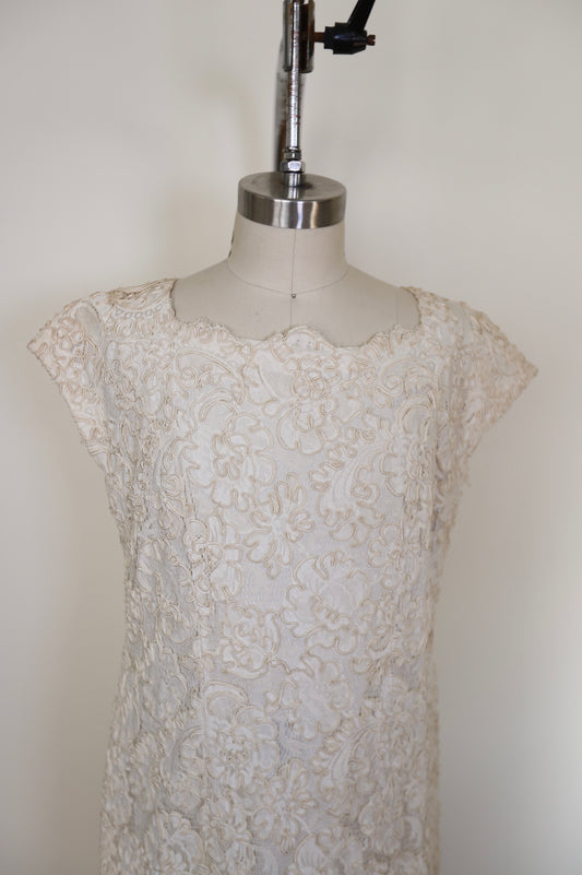 1960's Silk Lace Mesh Accented Gown With Removable Train & Veil