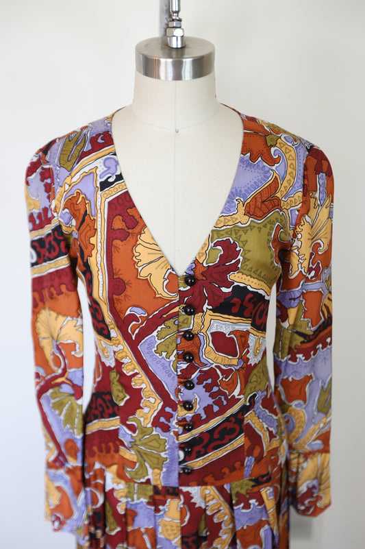 1970s Custom Made Printed Button Down Drop Waist Silk Dress