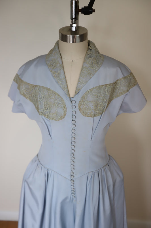 Late 1940s Early 1950s Princess Waisted Dress with Lace Detail and Panniers