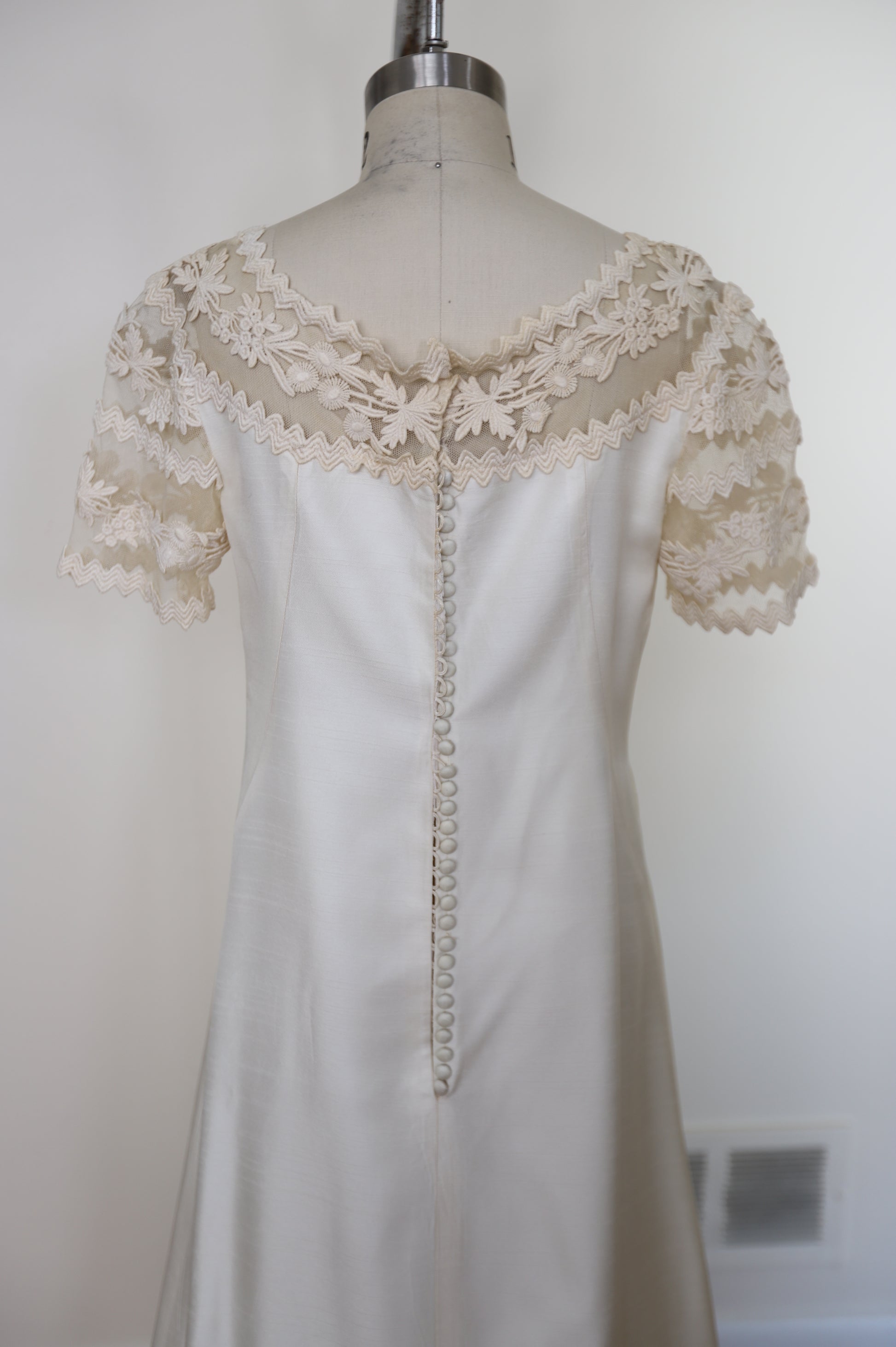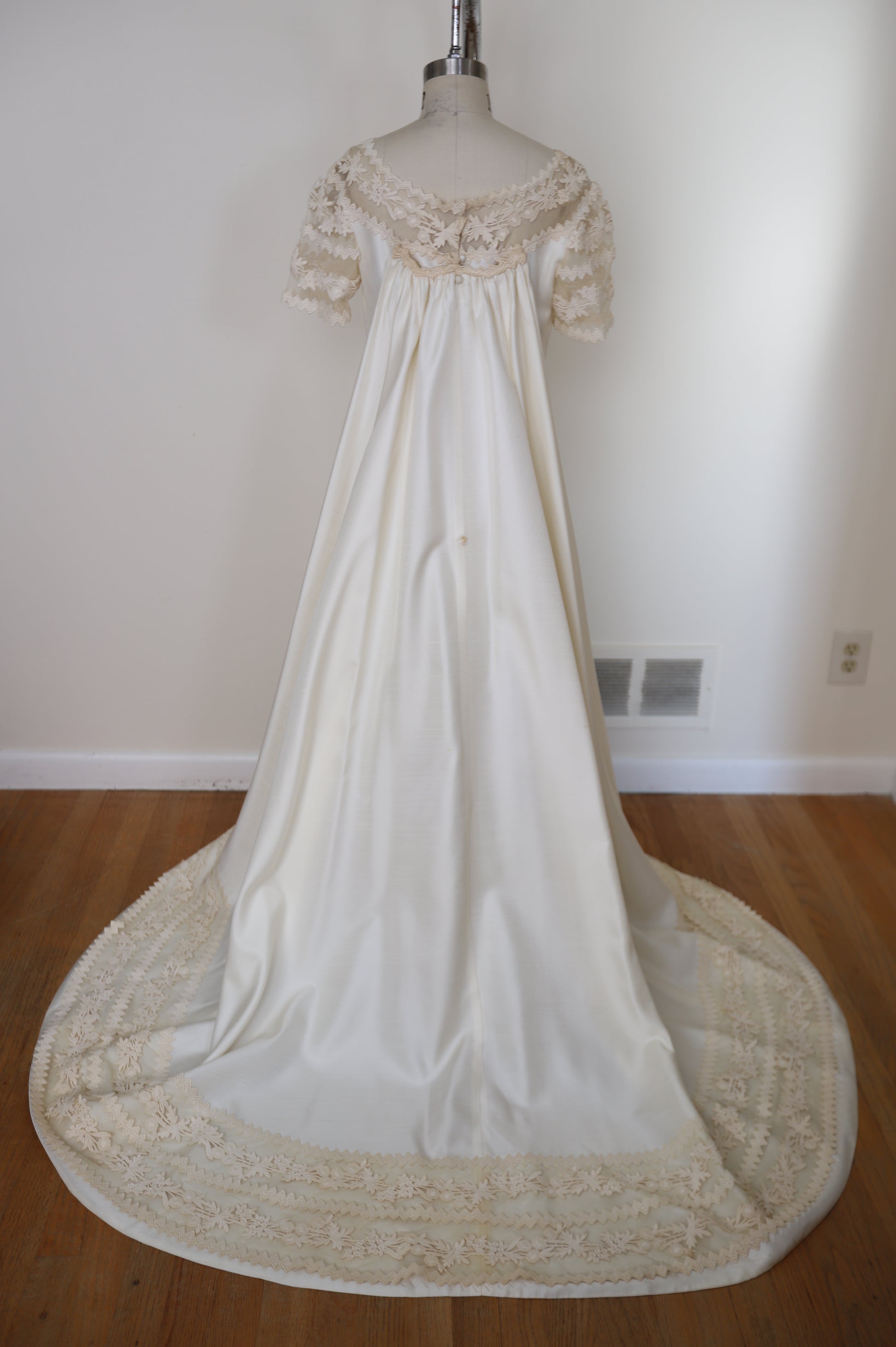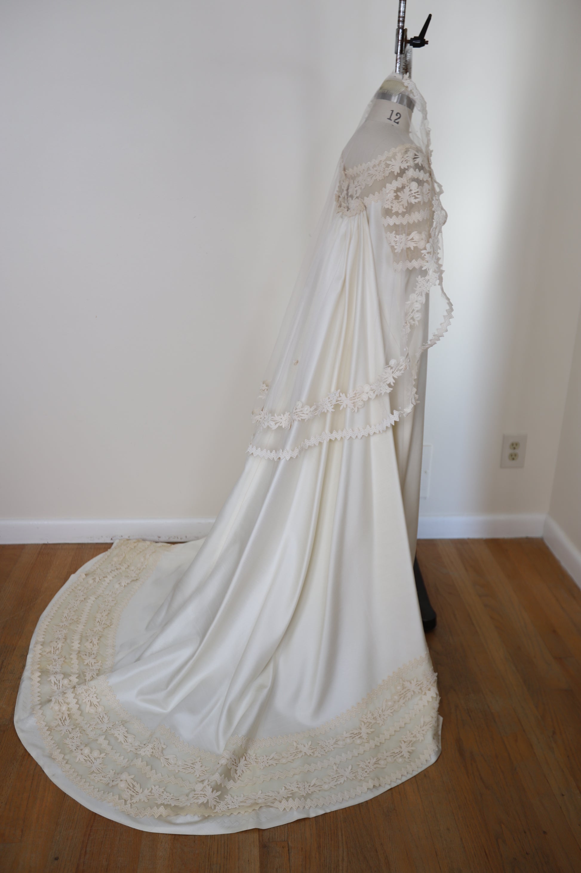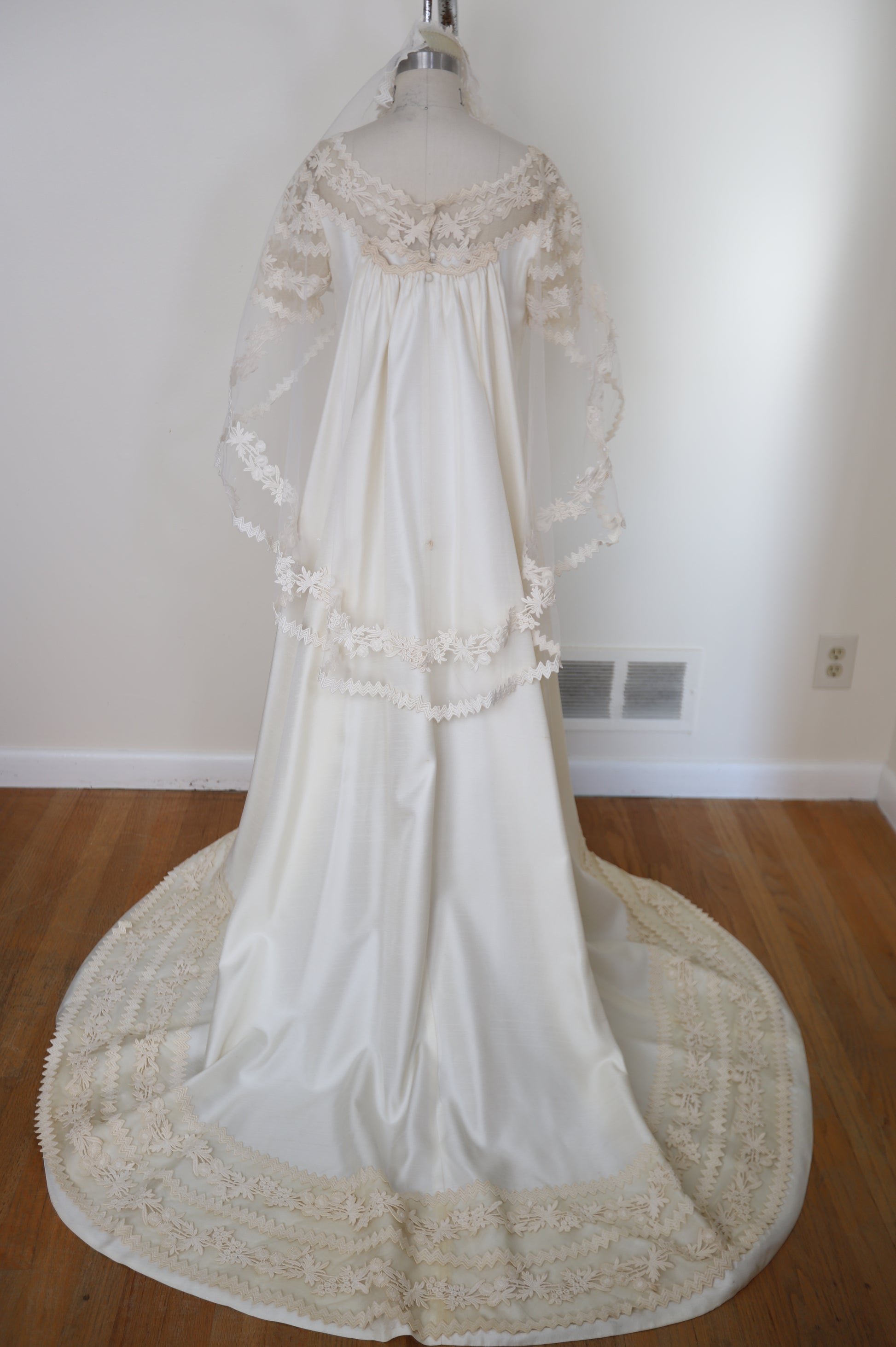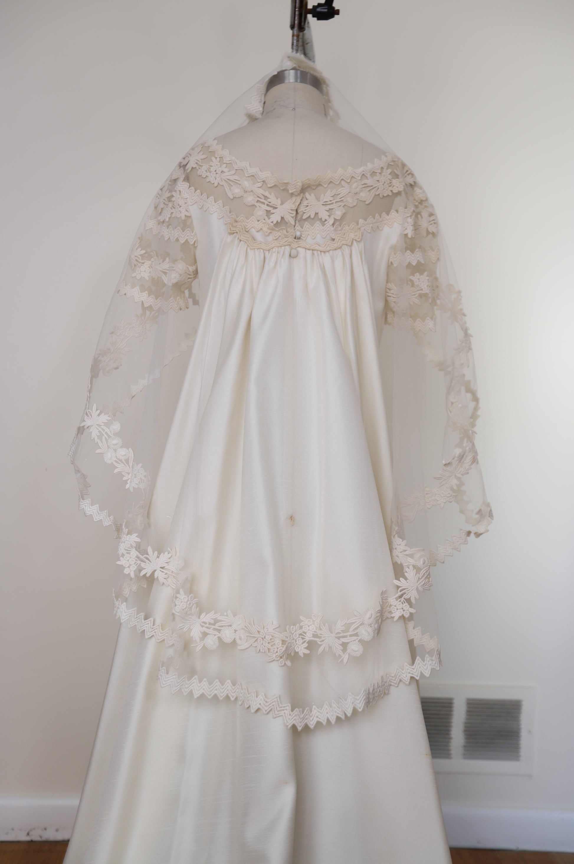 1960's Silk Lace Mesh Accented Gown With Removable Train & Veil