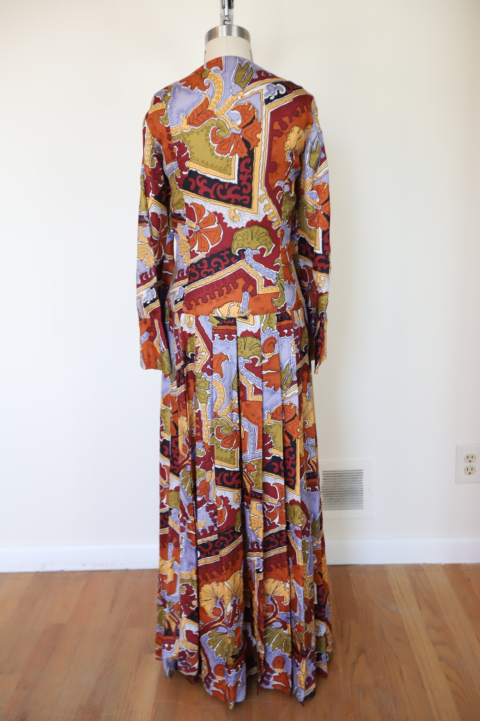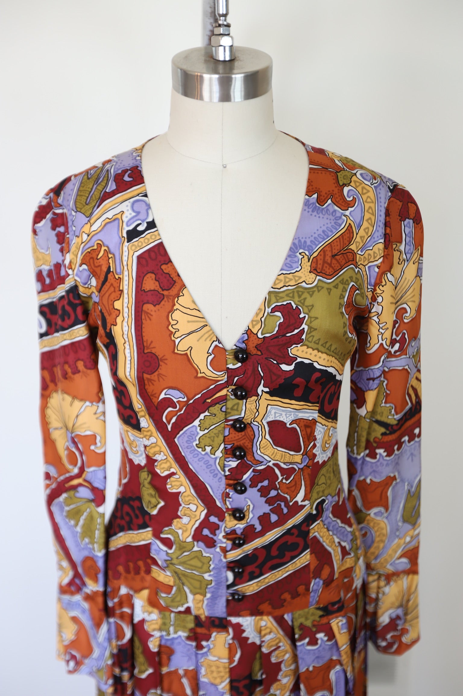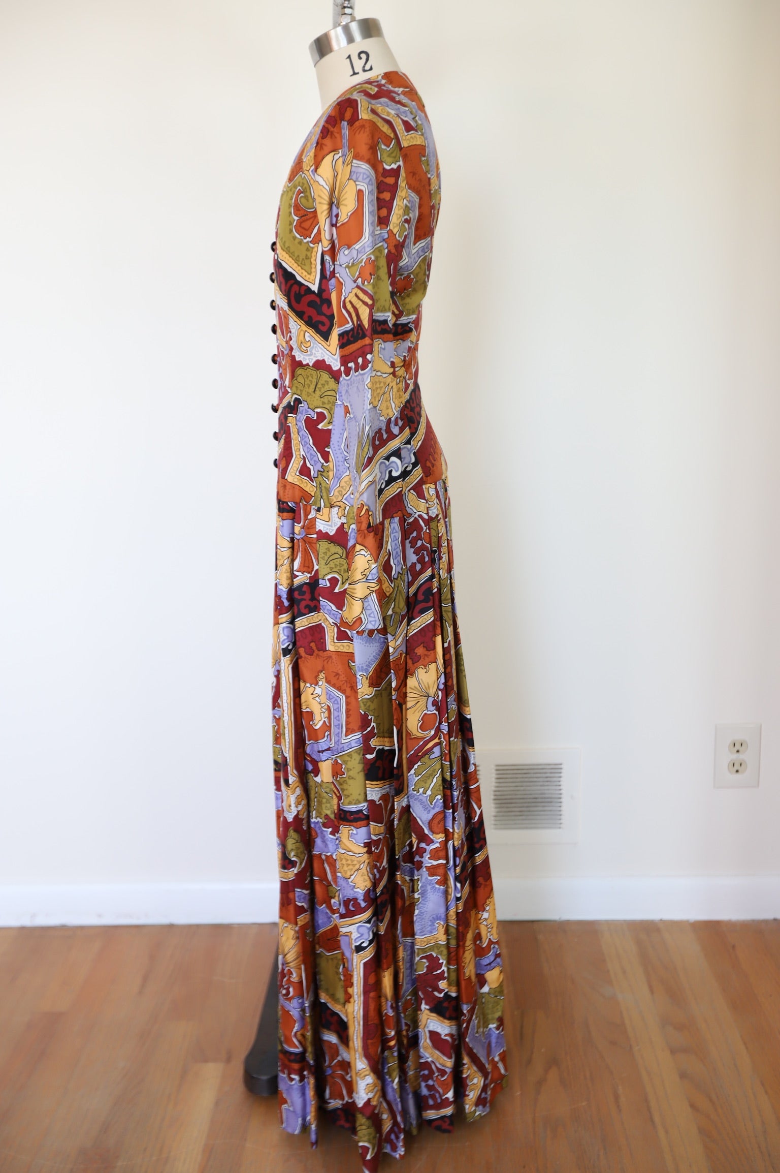 1970s Custom Made Printed Button Down Drop Waist Silk Dress