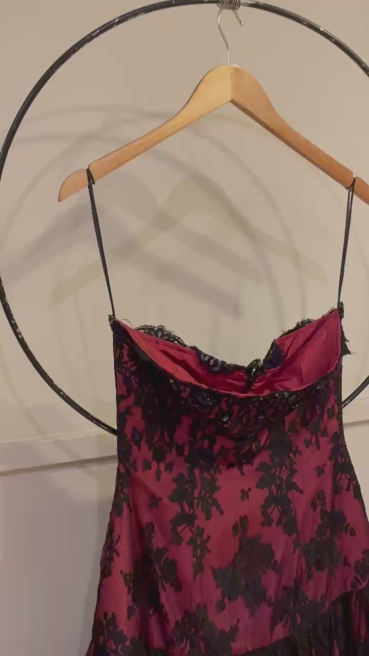 80s Drop Waist Strapless Gown W/Black Lace Overlay And Sequins