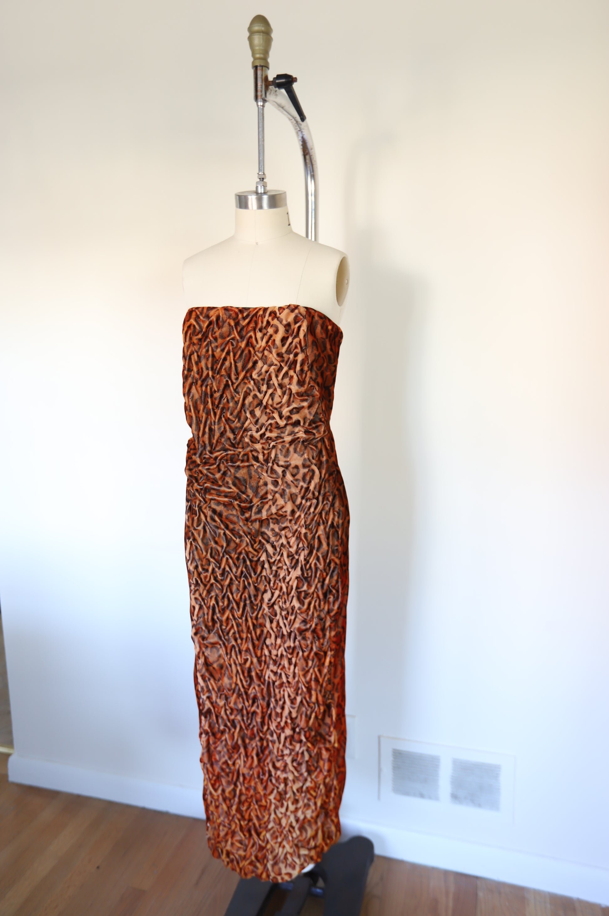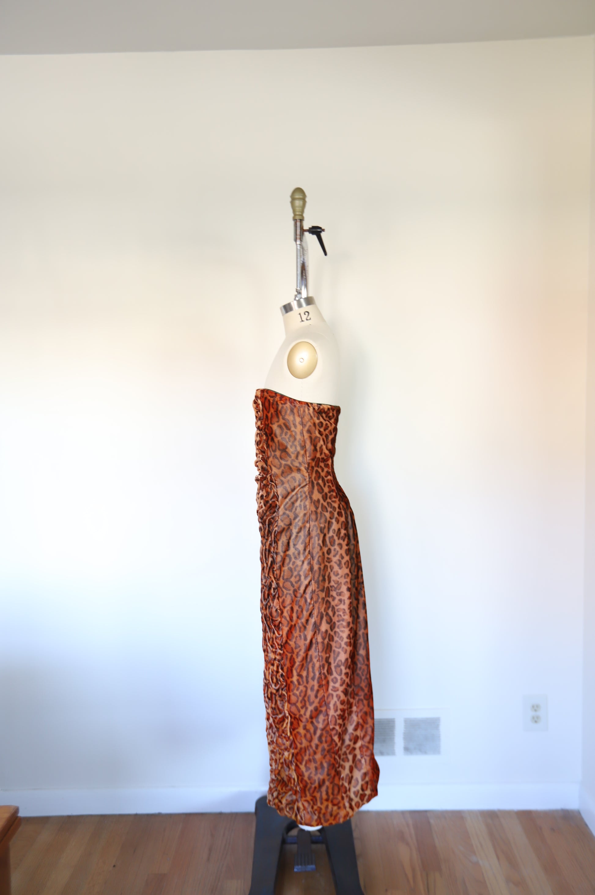 80s Vintage Strapless Studio 54 Ruched Pencil Midi Velvet Cheetah Dress