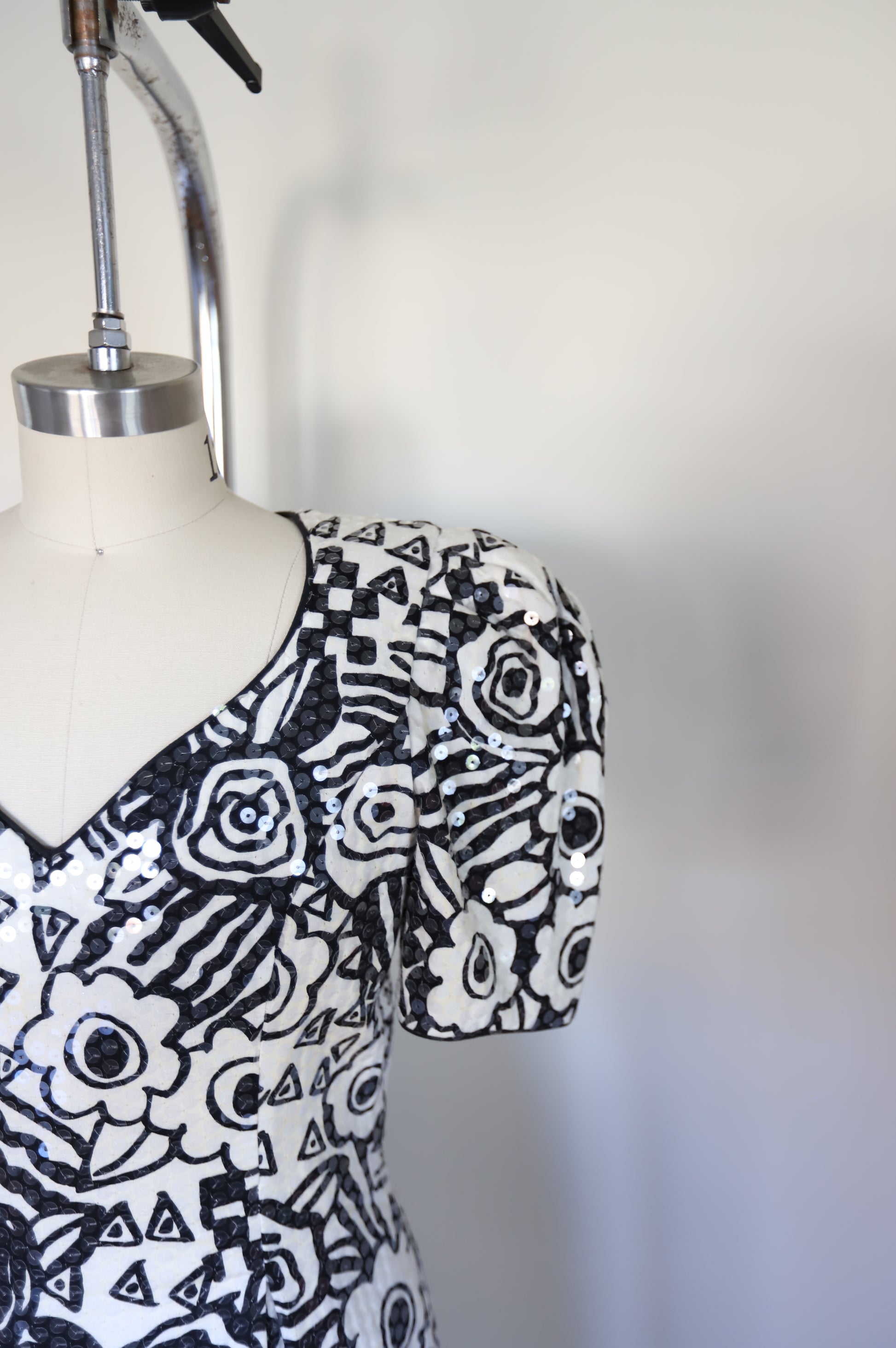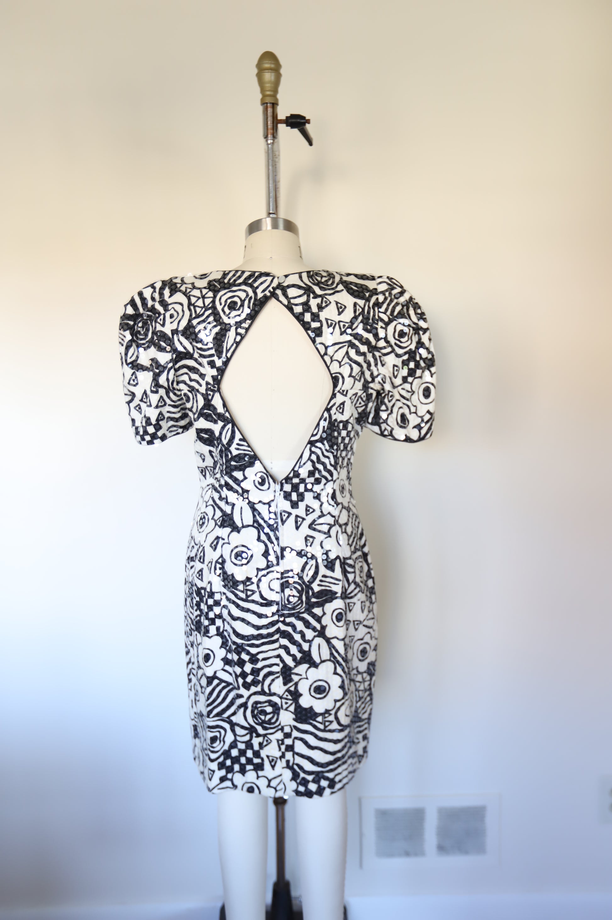 80s Vintage Studio 54 Rock-ability Style Floral/Geo Print Sequin Cut-Out Puff Sleeve Dress