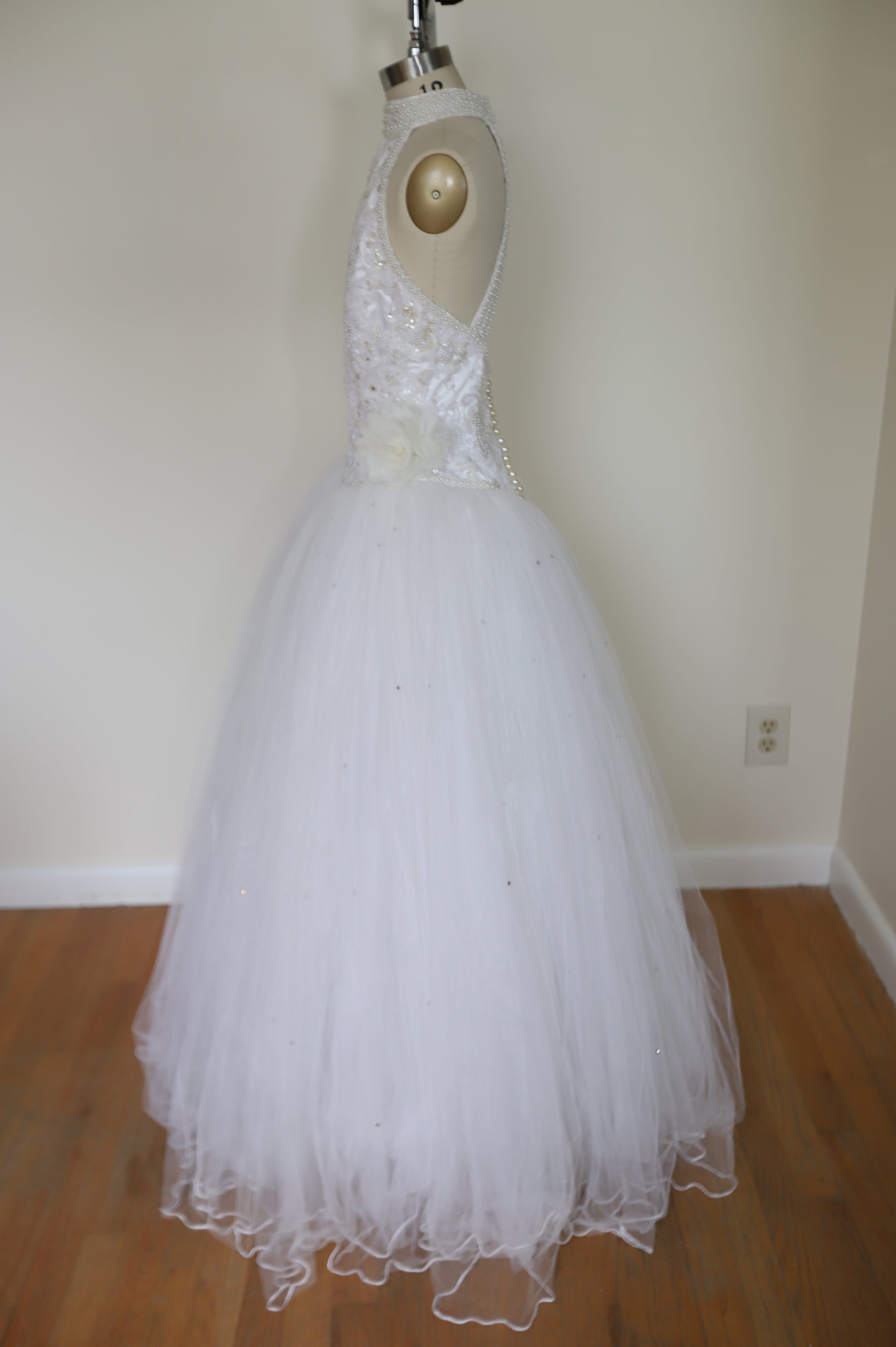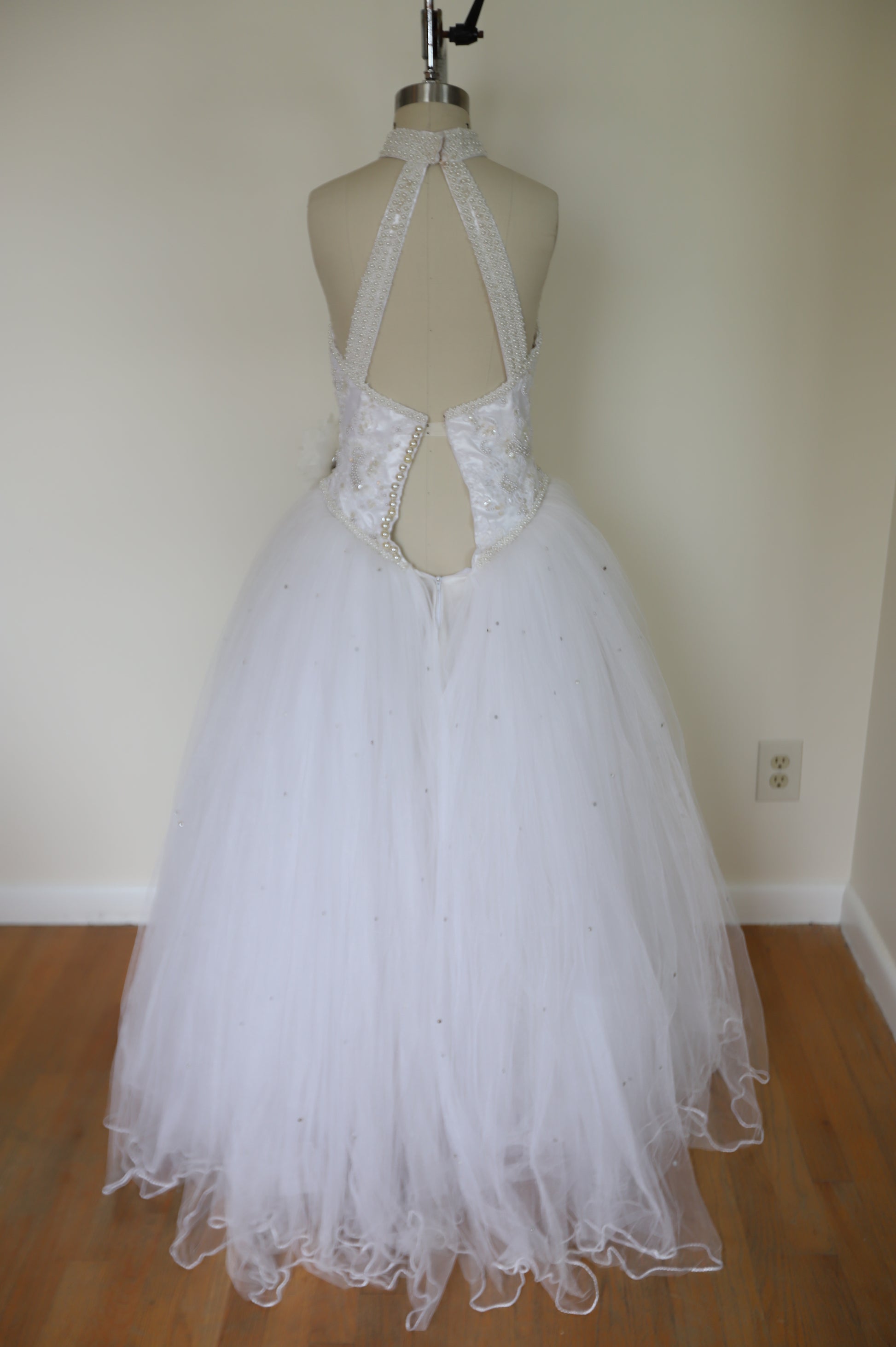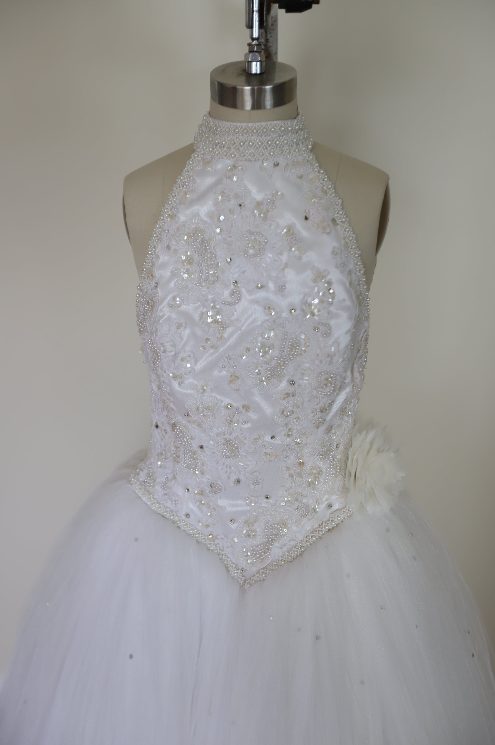 High Neck Open Back Beaded Tulle Drop Waist Bridal Gown